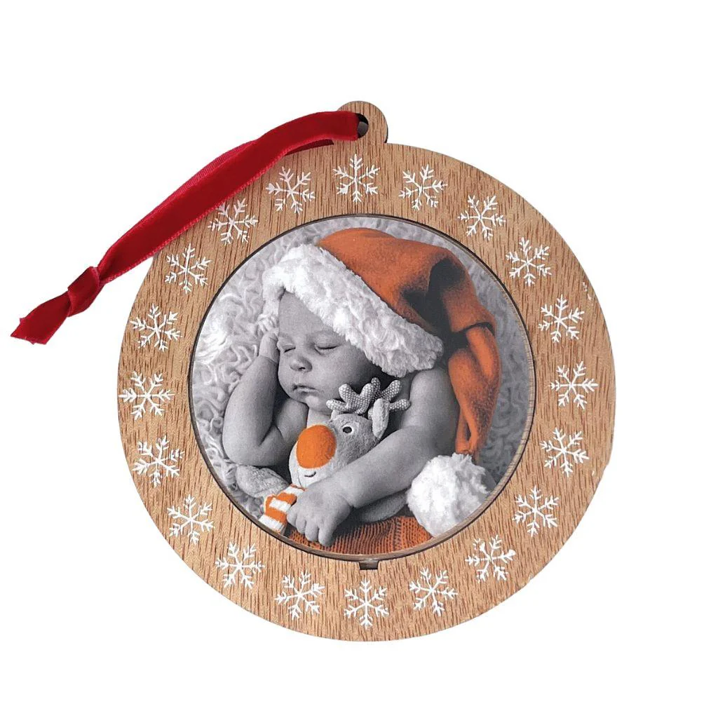 Unique stunning wooden photo Christmas tree hanger decoration. Make your own special ornaments this Christmas and create stunning results. Holds a round 70mm size print. Exceptional quality.
