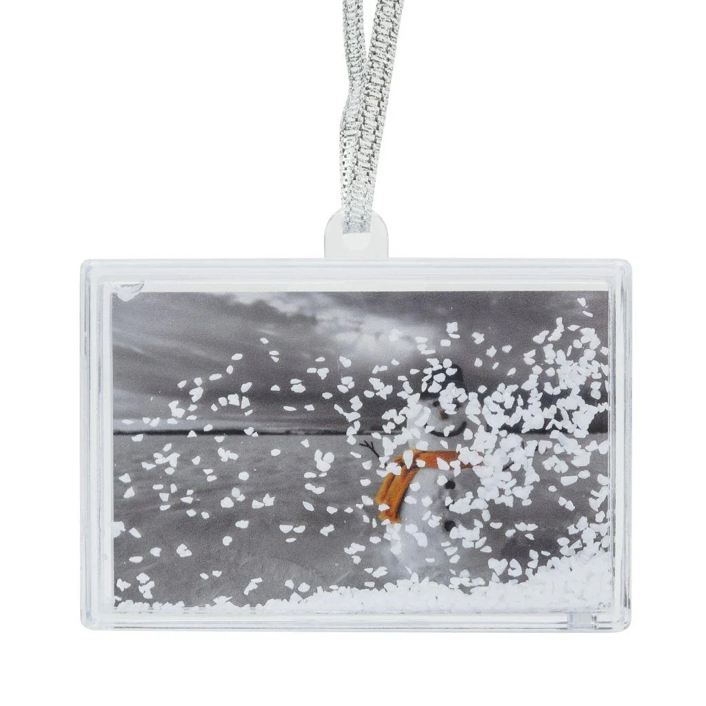 - Liquid snow filled frame with silver ribbon hanger